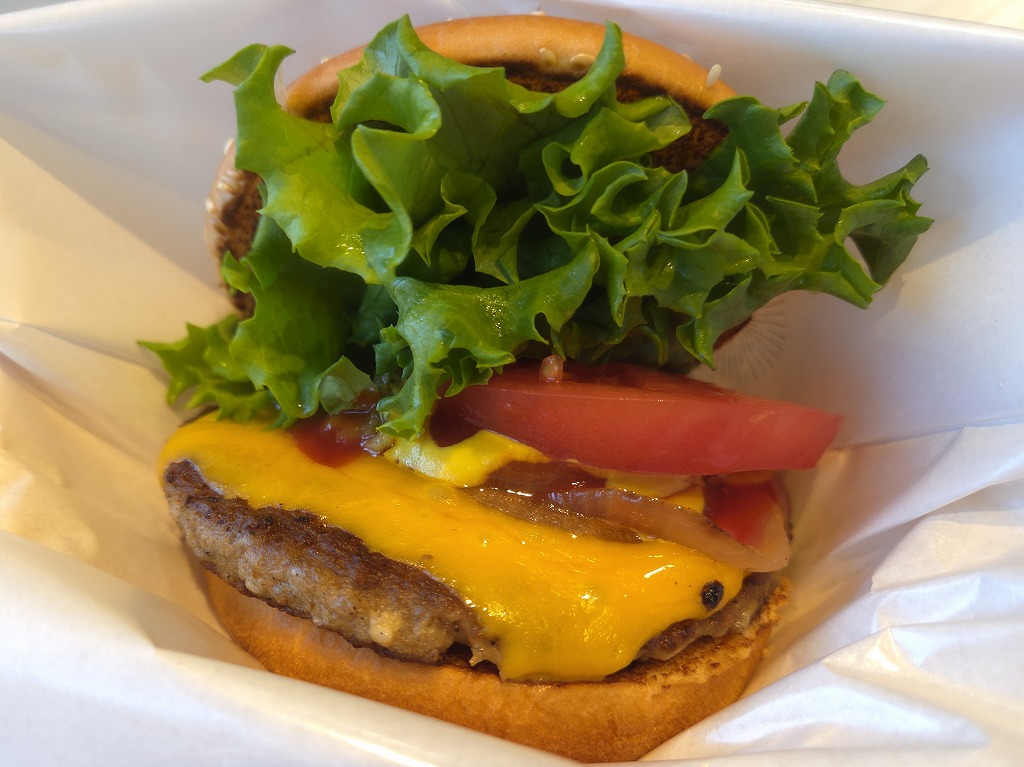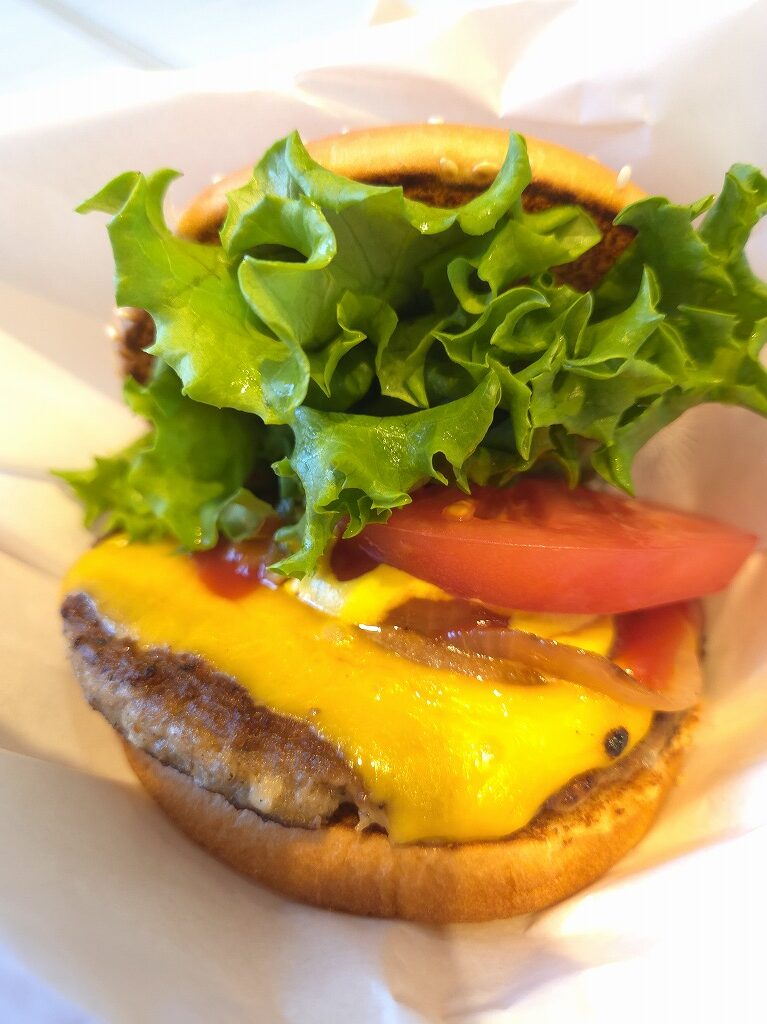 甘みを感じられるグリル玉ねぎ、国産野菜など、 こだわり、塩胡椒で肉の美味しさを引き立て、ケチャップとマスタードでシンプルに仕上げた王道ハンバーガー。野菜がシャキッと、パテもジュワッと、チーズはトロッと美味しい。