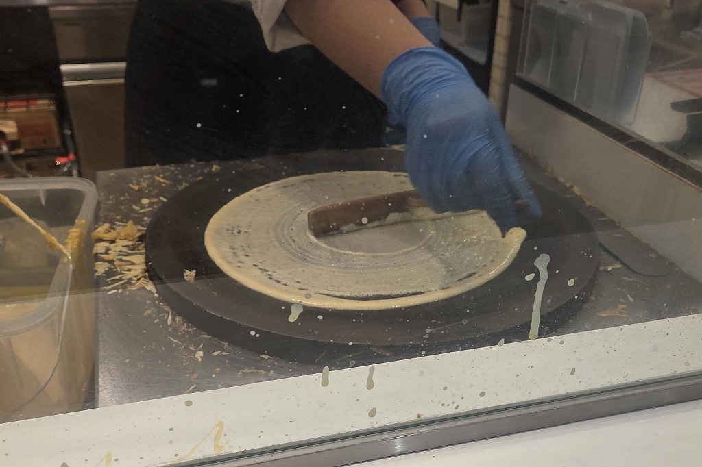 店員さんが手際よくクレープ生地を薄くのばし焼きます。