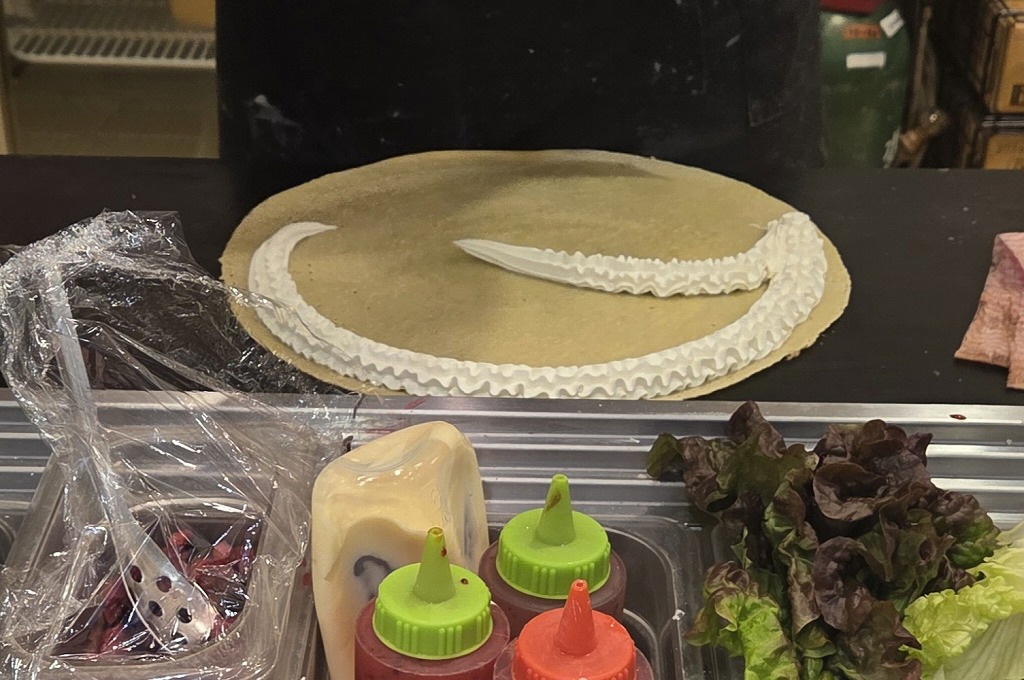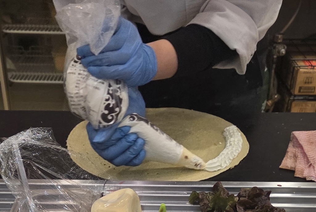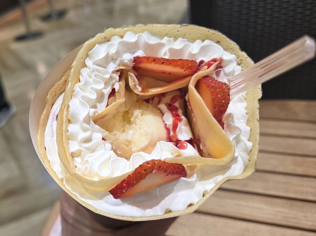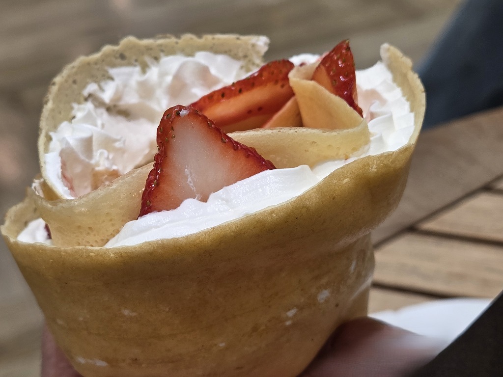手際よくきれいに薄く焼き上げたクレープに生クリームとフルーツ、ソースをトッピング、くるりと巻き上げ、私の手元に。。。。