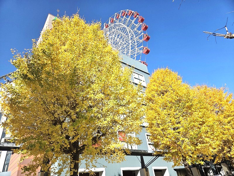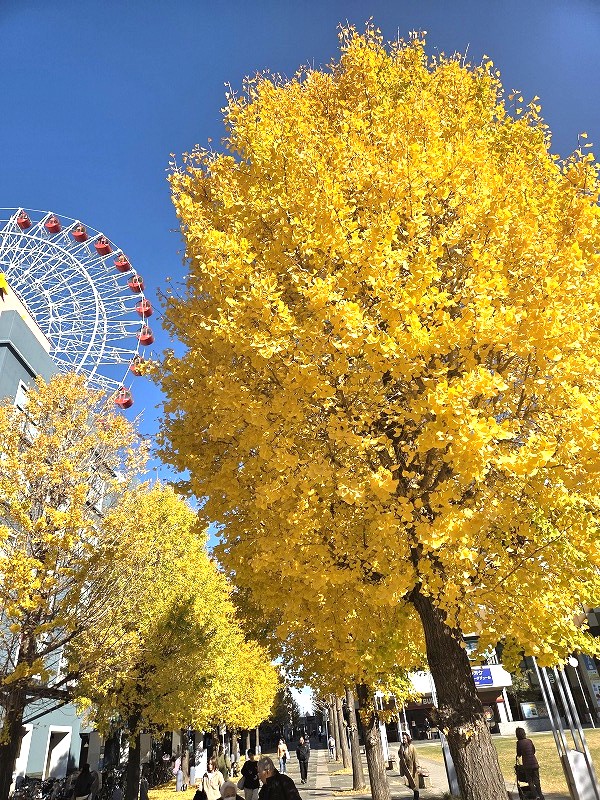 空高くそびえ立つイチョウの木々が、駅前に並び、見上げれば黄金色の葉が太陽の光に輝き、まるで絵画のような世界が広がります。観覧車との対比も美しい!