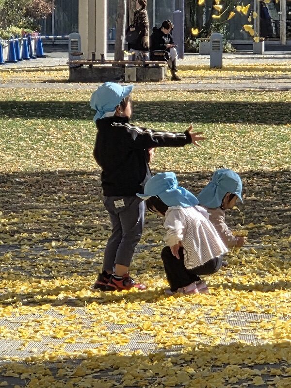 小さな子供たちがイチョウの落ち葉で遊んでいます。