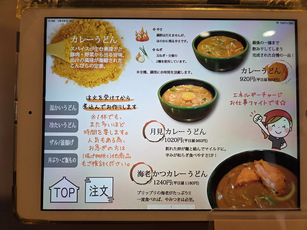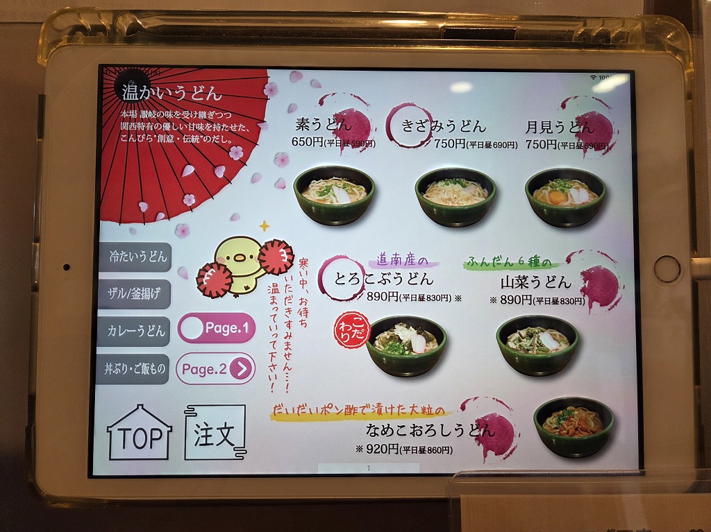 ご飯ものとのセットが押しなのかもしれませんが、私はうどん目的なので、それに寒いので暖かいうどん「月見うどん」をチョイス。