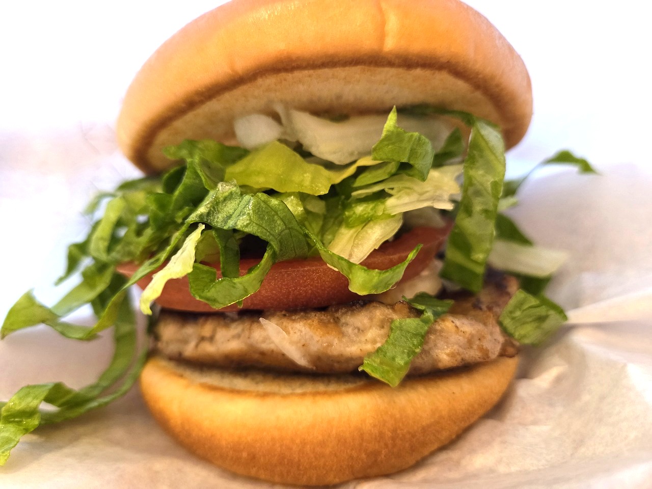 バンズの間に柔らかなパティとたっぷりの野菜(レタス・トマト・オニオンスライス)の間にオーロラソースが良いバランスです!
