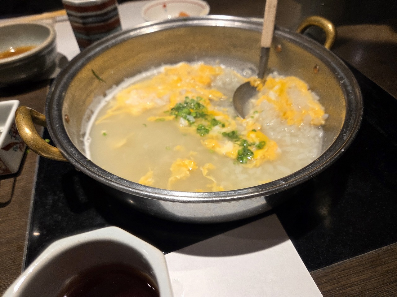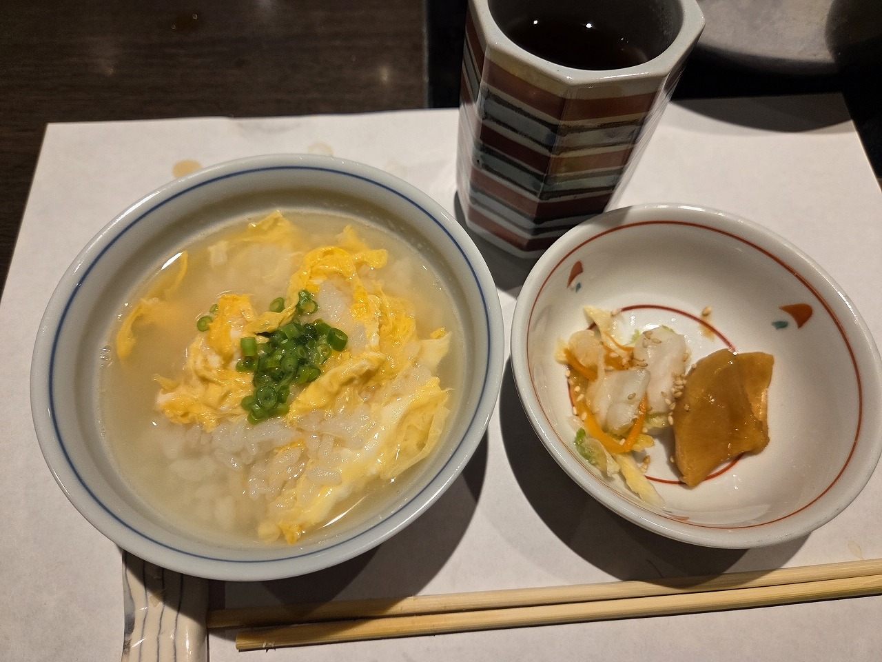 てっちりのあとでお姉さんが雑炊にしてくれます。卵でとじて美味しいです。